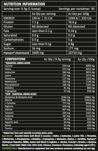 A Sport Amino also contains PeptoPro®, a patented hydrolysed protein ingredient made from milk protein casein. It has the same amino acid profile as casein, which is excellent for recovery thanks to the high Glutamine levels along with the full spectrum of Essential Amino Acids (EAA’s). As most people know, Casein in its native form is very slowly digested, however by hydrolysing the casein in PeptoPro®, the result is a protein consisting of many small peptides (>60% di and tri-peptides) and very few free form amino acids.